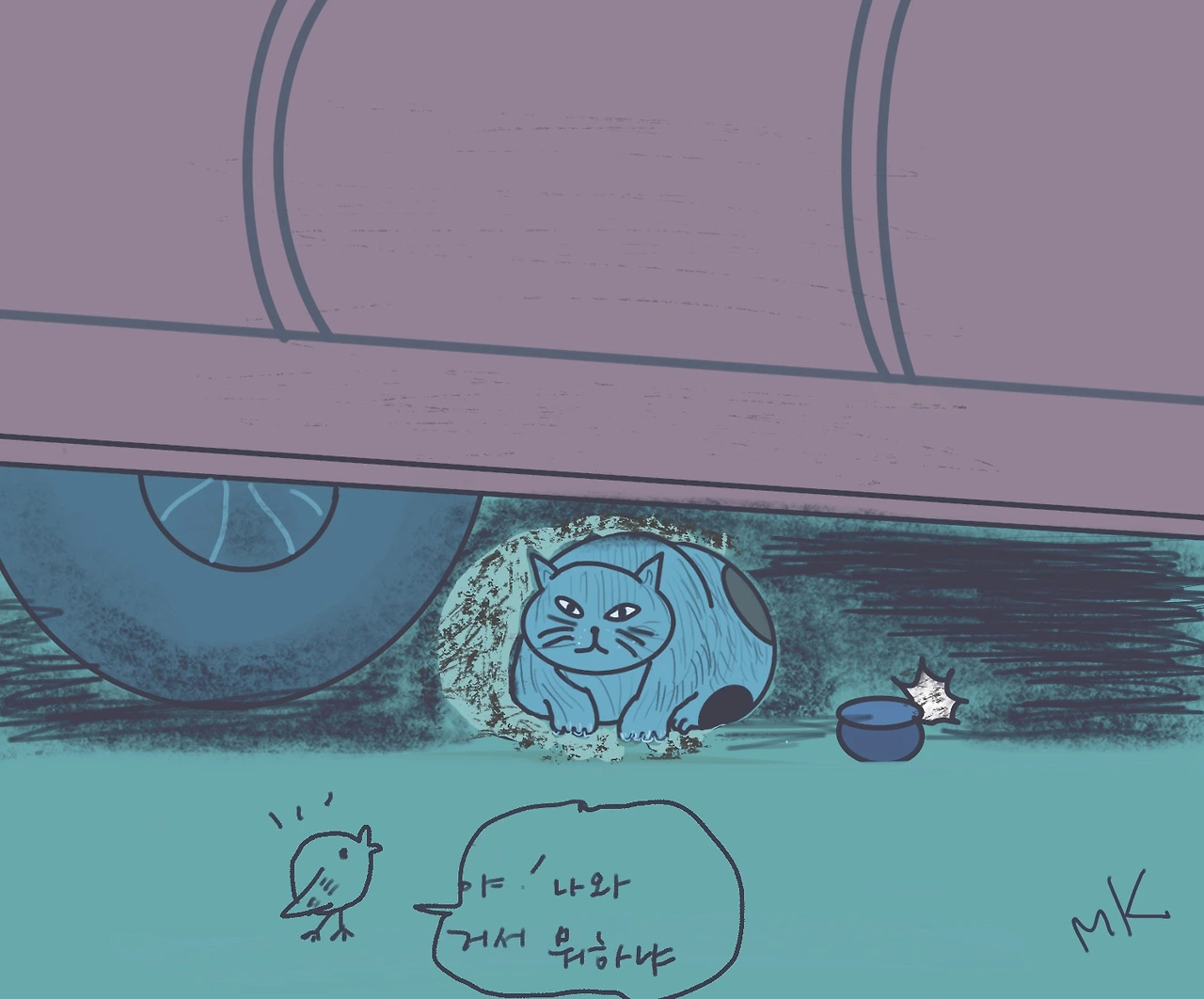 마치 깊숙이 숨은 자동차 밑바닥 고양이처럼