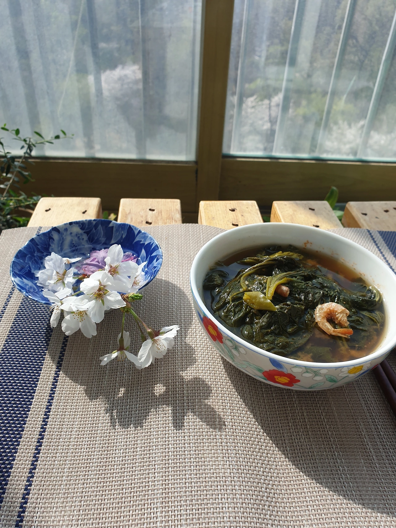 오전에 아욱국을 한솥 끓여서 벚꽃만발한 점심에 숲을 바라보며 퍼 먹었더니 뭔가 쑥 하고 내려가는 기분이다.