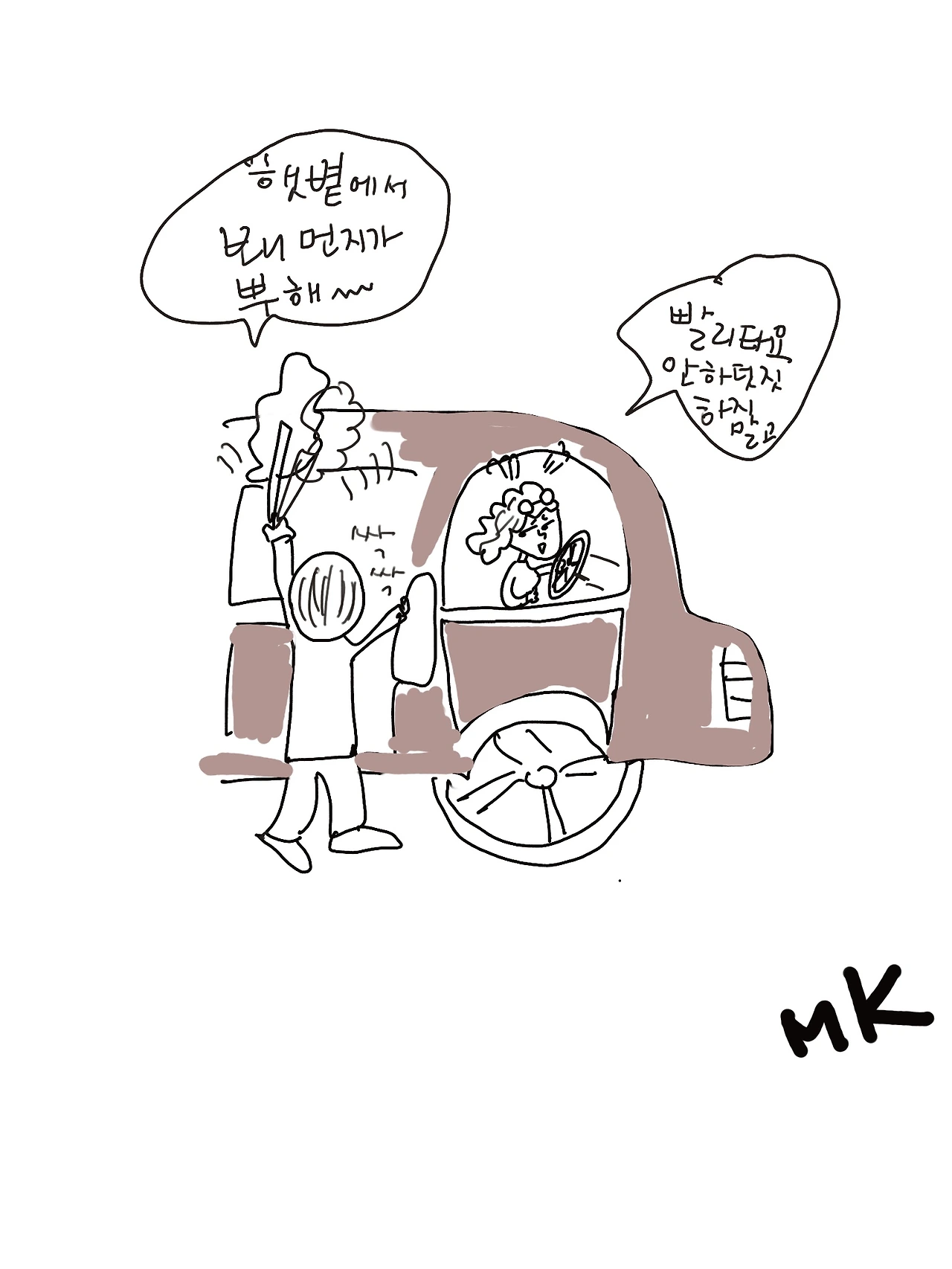 "빨리 가자니까 웬 땡볕에 차 유리를 닦고있어요. 평소에 안 하던 짓 하지 말고 얼른 타요"