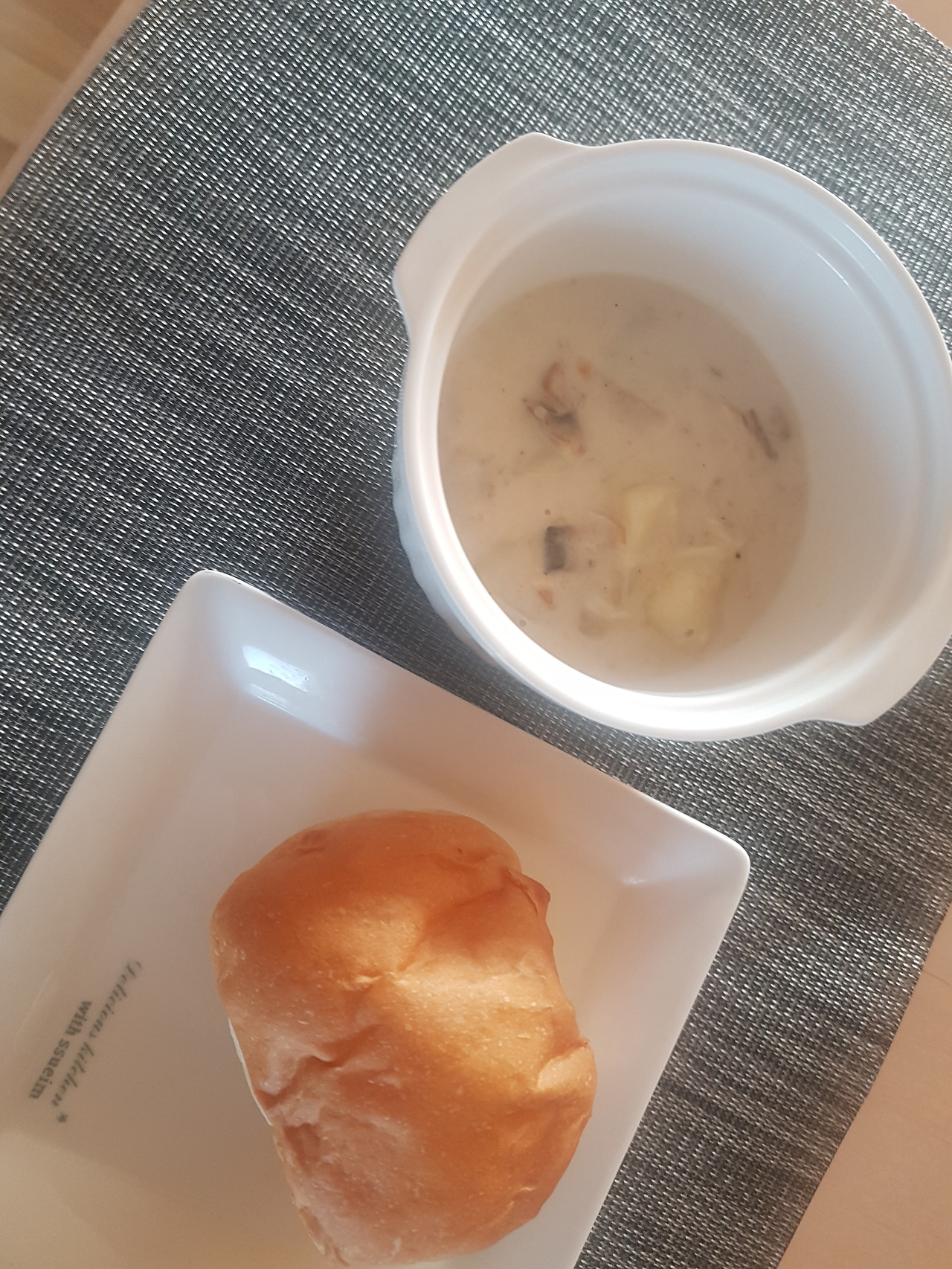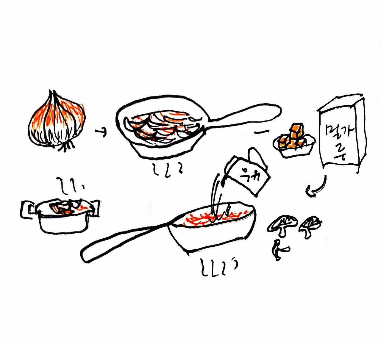 양파를 듬뿍 넣어 갈색이 나도록 캐러멜 라이 징 하고 버터에 밀가루 넣어 볶다가 표고와 우유 넣어 끓인다. 맛은 그다지이다.