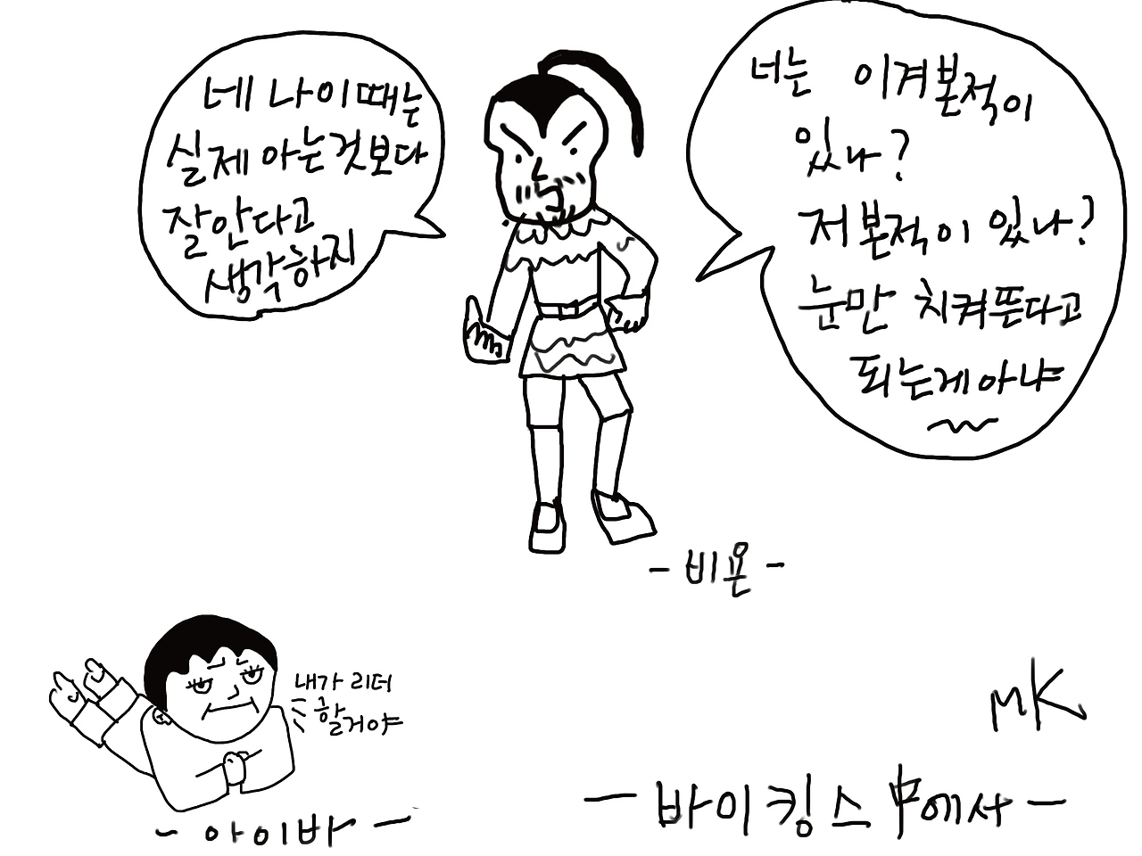 이복형제인 아버지의 사랑을 독차지한 둘째 부인의 아들 젊은 아이바와 첫째 부인의 아들 비욘의 대화이다.