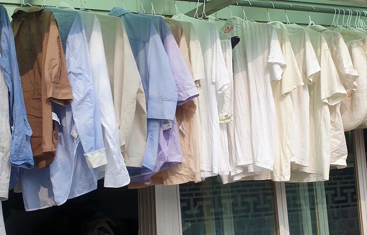 ( 거리에서 본 세탁소빨래가 햇볕을 쬐고 있다.)