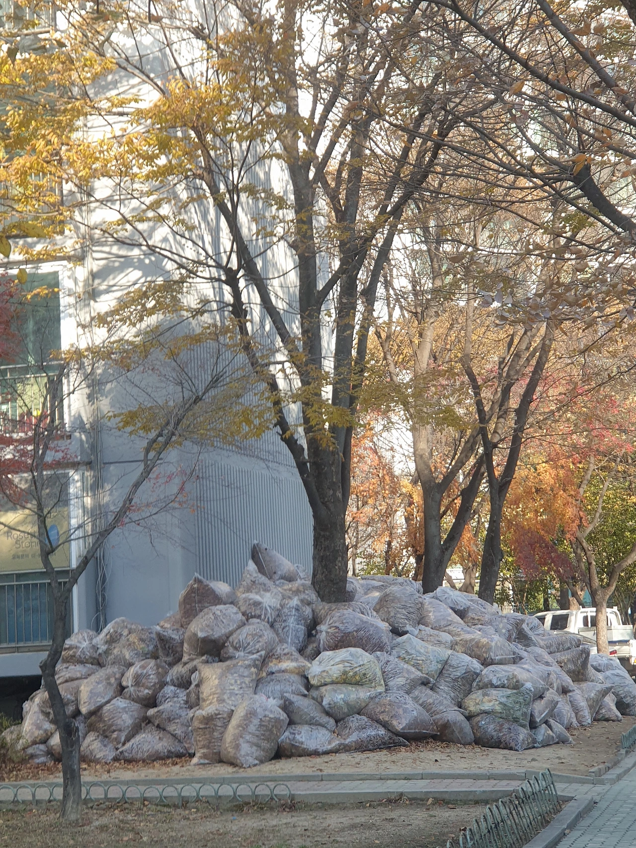 동네 한 바퀴 돌다 보니 거리의 나뭇잎들이 잎을 다 떨구고 이삿짐을 꾸리듯 봉투 봉투에 담겨있다.