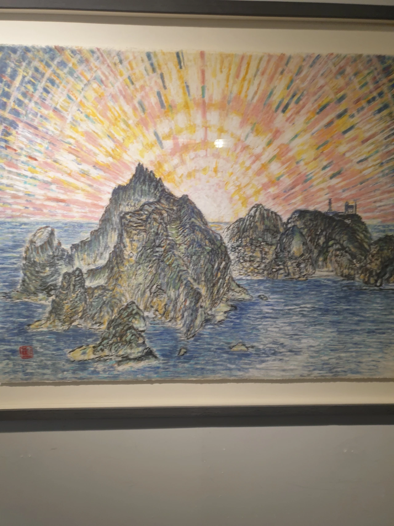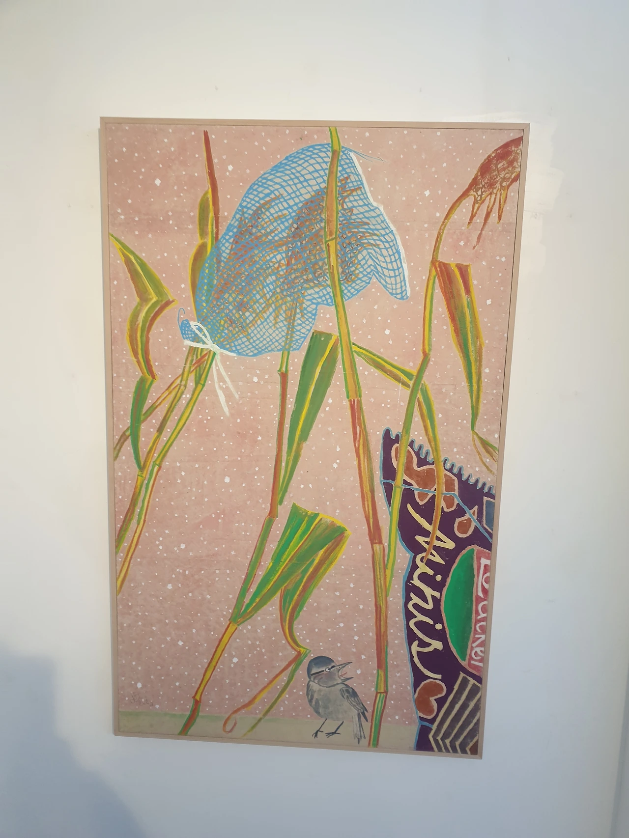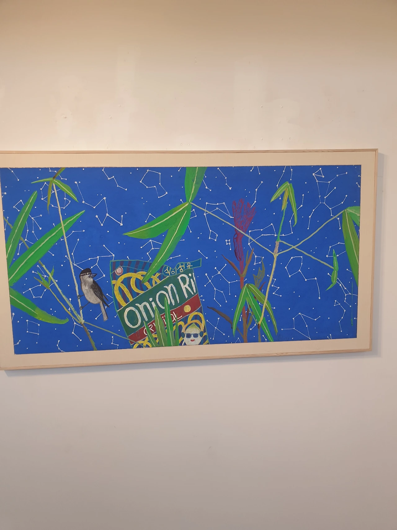 '낮별'이라는 작품이 특히 좋았다. 낮에도 별은 뜨지만 밝음에 가려서 보이지 않는 장면을 작가는 살아가는데 진짜 중요한 것이 무엇인지를 빈과자 봉지를 탐하는 새에 비교하여 장지에 분채로