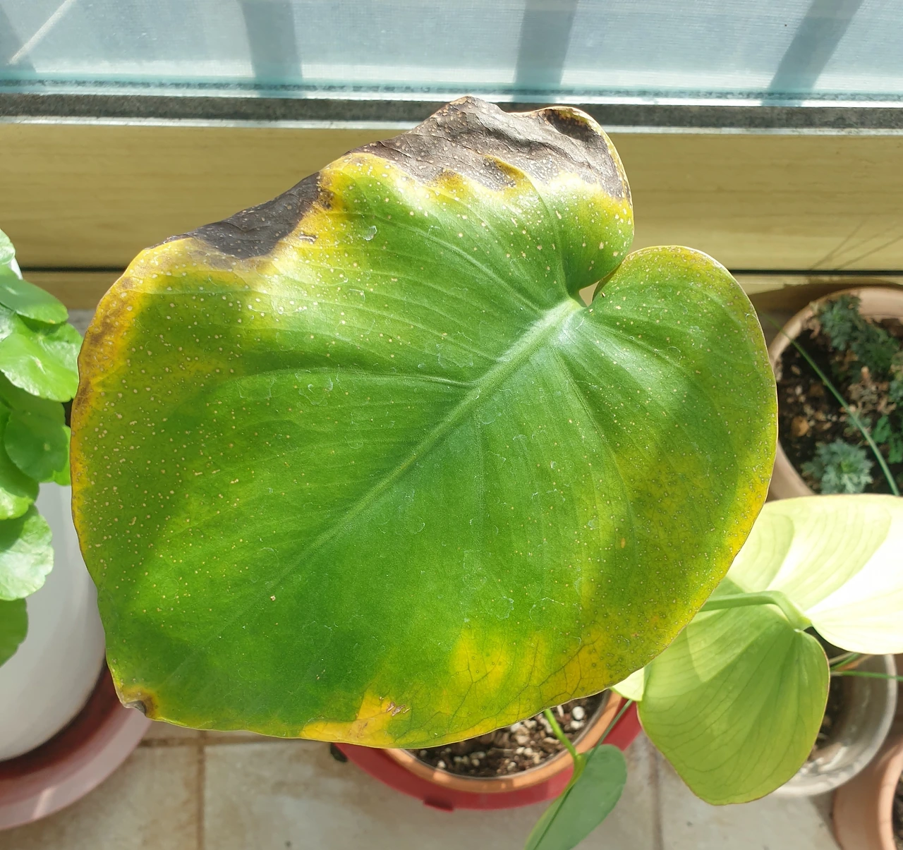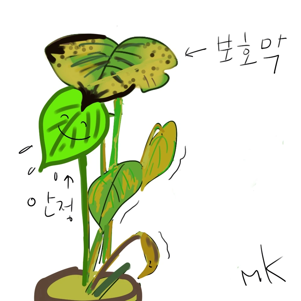 일찍이 들여놓지 못한 화분 몇 개 중 몬스테라 화분에 맨 위에 넓은 겉잎이 말라서 비틀어지고 있는데 그 아래쪽 안쪽 초록 잎이 생생하다.