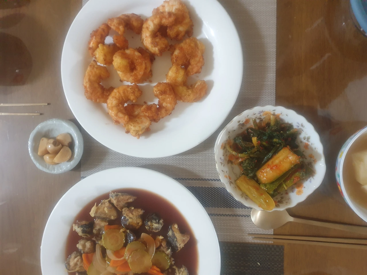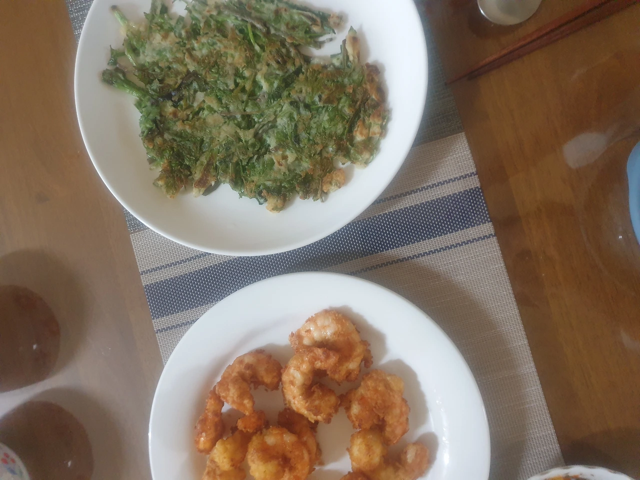 비 오는 날에는튀김류가 당기므로 미나리 파전 표고탕수 새우튀김을 만들고 식구들과 막사(막걸리 +사이다)를 마셨다.