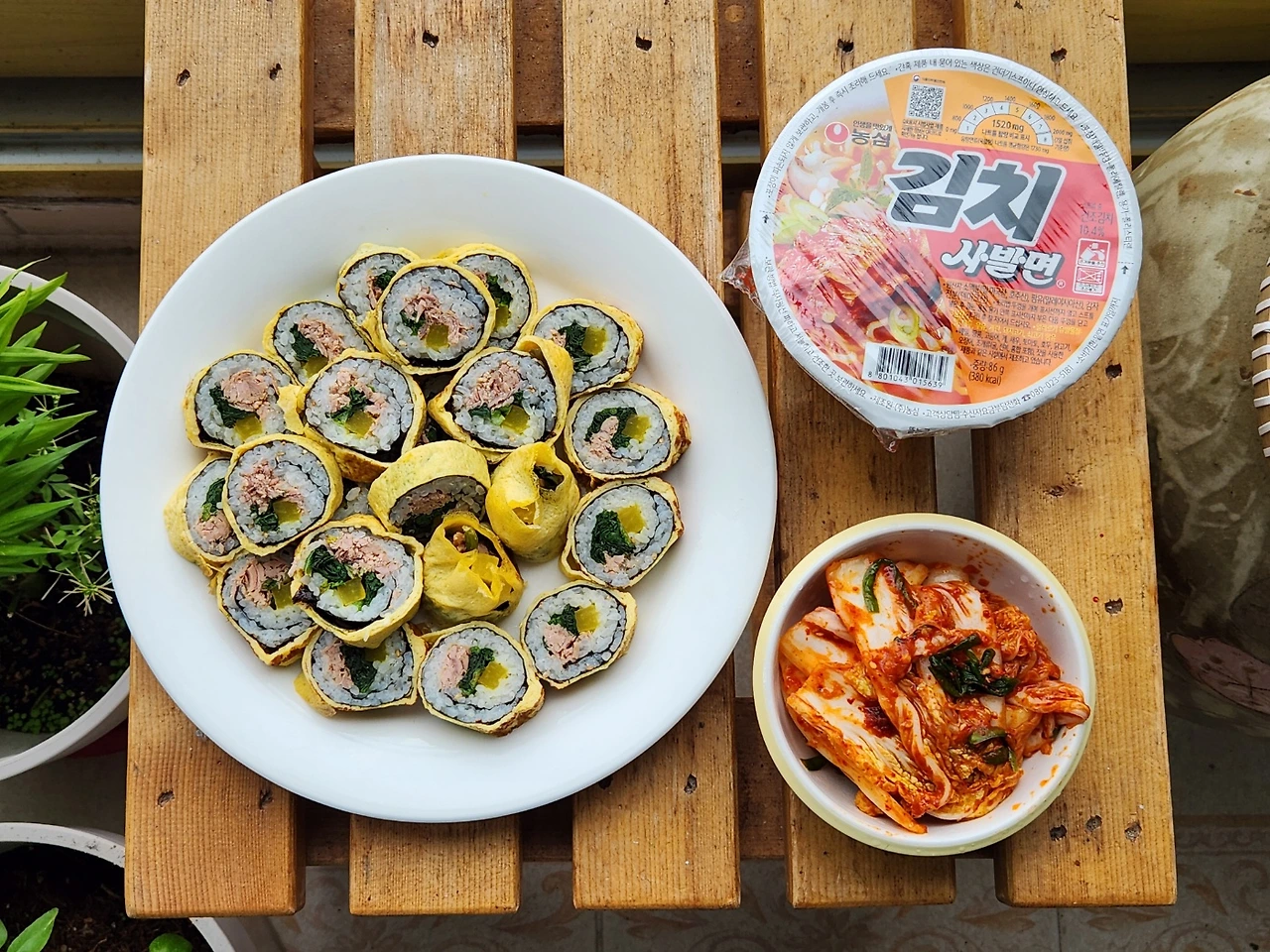 라면의 짝꿍인 김밥의 재료는 완벽하지 않아도 냉장고 속에 있는 재료로 참치캔 단무지 시금치를 넣어 싸고