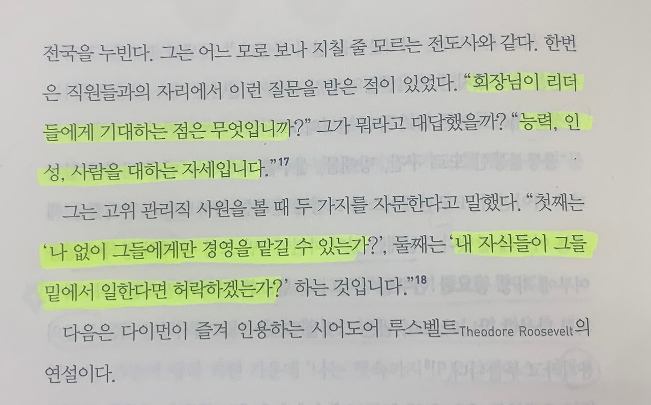 그가 리더들에게 기대하는 점은 능력, 인성, 사람을 대하는 자세이다.