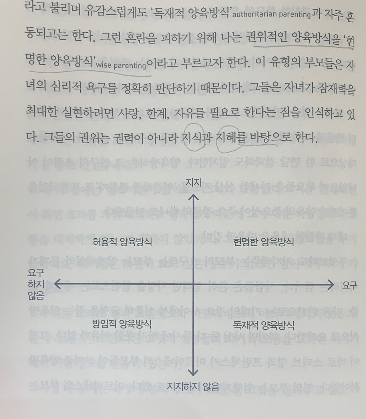 현명한 양육방식:(권위적 양육방식) 많은 요구를 하는 동시에 지지해 주는 유형. 그들은 자녀가 잠재력을 최대한 실현하려면 사랑, 한계 자유를 필요로 한다는 점을 인식하고 있다. 그들의 권위는 권력이 아니라 지식과 지혜를 바탕으로 한다. "다정하고 자녀를 존중하며 요구를 많이 하는 부모를 둔 청소년들이 학교 성적이 좋고 독립적이며 불안과 우울 증상이 적고 비행에 가담할 가능성도 낮았다."