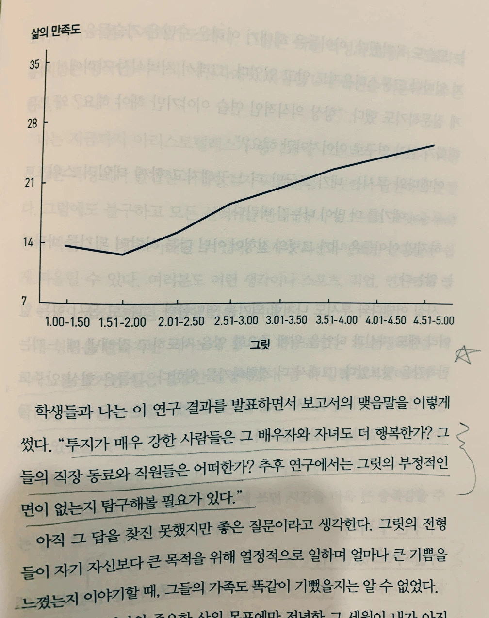 이 그래프는 그릿과 삶의 만족도의 관계를 보여준다. 그 결과, 그릿이 높은 사람일수록 건강한 정서적 삶을 즐길 가능성이 높다고 나타났다.