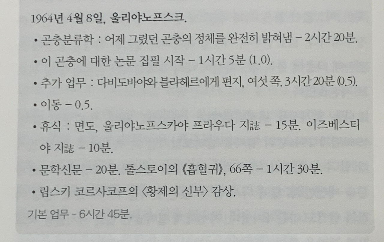 시간 통계 같기도 한 이 일기장을 류비세프는 수십 년간 빠짐없이 작성했고, 연말 결산도 하면서 계획을 세우기도 했다. 나는 이 시간 기록을 보았을 때, 회사에서 처음에 작성했던 업무일지가 생각났다. 작성방식은 유사하지만 어떻게 사용되고, 정말로 이것이 유용하게 쓰였는지에는 큰 차이가 있을 것 같다. 아마도 류비세프는 이러한 관리 방식이 루틴처럼 자리 잡아 힘들이지 않고 그러나 매우 효율적이고 효과적으로 업무 처리를 했을 것 같다.