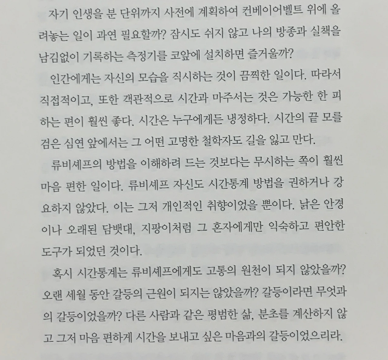저자는 자기 인생을 분 단위까지 계획하고 관리해야 하는 건지 초반에 의문을 갖는데, 사실 나 또한 그러한 의문을 가졌다. 그런데 어차피 류비셰프는 누구에게 강요한 적이 없고, 본인의 시간을 관리하면서 그만의 방식으로 이를 이용하여 삶을 살아간 것이다. 그 오랜 시간 동안 꾸준히 한다는 것은 정말 존경할만하다는 생각이 든다.