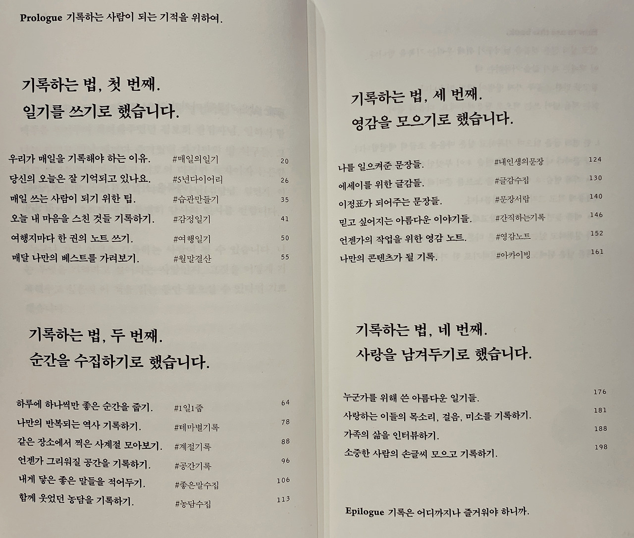 '기록하기로 했습니다'라는 제목만 보았을 때, 기록 습관에 대한 이야기가 아닐까 짐작했다. 일부는 나의 짐작이 맞았지만, 사실 이 책에서 말하고자 하는 것은 잊어지는 소중한 것들을, 무심히 놓쳐버리는 아름다운 순간들을 간직하기 위해, 그 당시의 감정과 마음, 모습 등 모든 것을 너만의 언어나 방식으로 기록해 보라는 것이다.