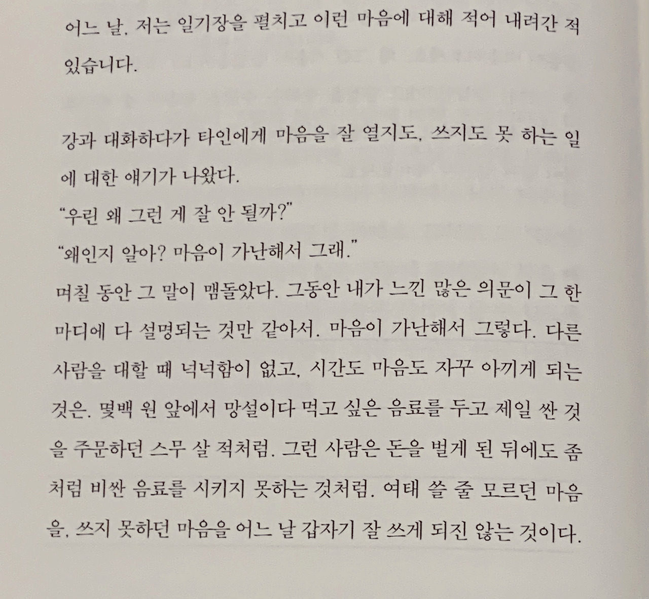 마음이 가난해서, 다른 사람을 대할 때 넉넉함이 없고, 시간도 마음도 자꾸 아끼게 된다는 것에 고개를 끄덕이게 된다. 정확히 꼬집어 이거다라고 말하기는 어렵지만 나도 이런 상황이 종종 있었던 같다.