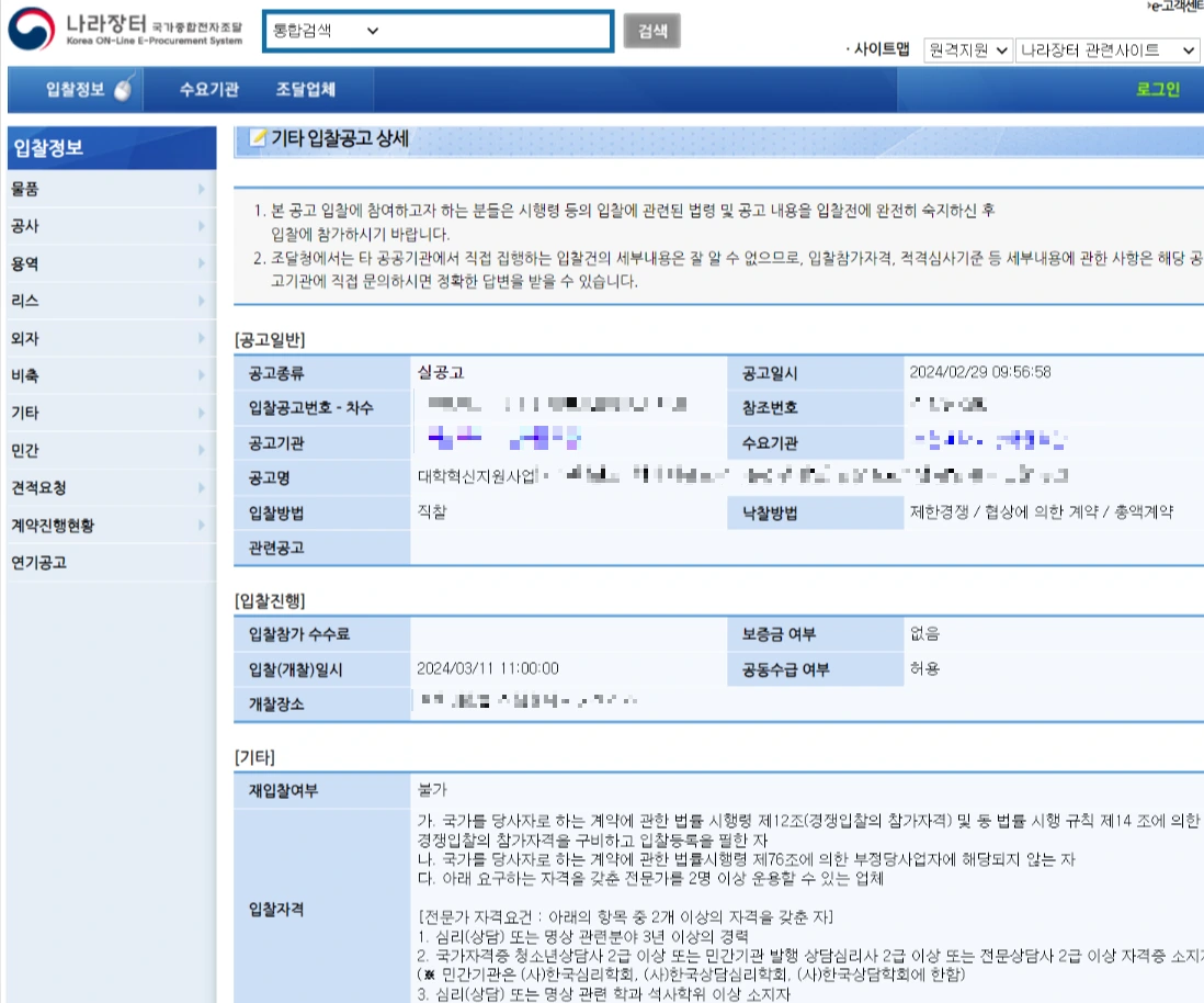 1. 제한 경쟁입찰이기에 대학교 입찰 공고를 빠르게 확인하는 것이 좋다. 나라장터(www.g2b.go.kr) 또는 학교 홈페이지를 통해 수시로 확인해야 하는데, 대학교의 경우 빠르게 시작할 듯하지만 경험상 2월 말, 3월 초에 나는 것을 확인할 수 있다. 그리고 생각보다 제안을 준비하는데 많은 시간이 주어지지는 않기에 신속하게 준비해야 한다.