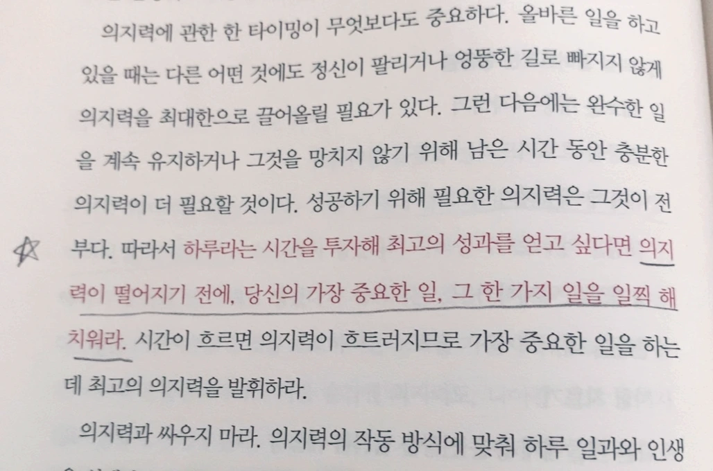 의지력이 가장 높을 때 가장 중요한 일을 우선으로 처리해야 한다. 중요한 일은 하루 중 가장 의지력이 충만한 시간에 하라는 뜻이다.