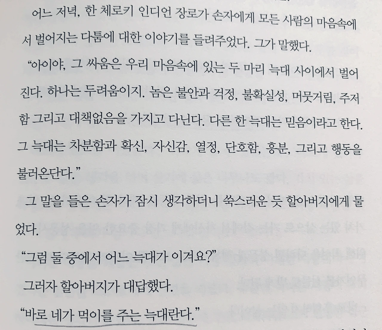 인디언 할아버지와 손자의 이야기도 기억에 남는다. "네가 먹이를 주는 믿음이라는 늑대가 이긴다." 이 말이 나에게는, 주저할 때마다 믿음이 필요하다는 깨달음을 준다.