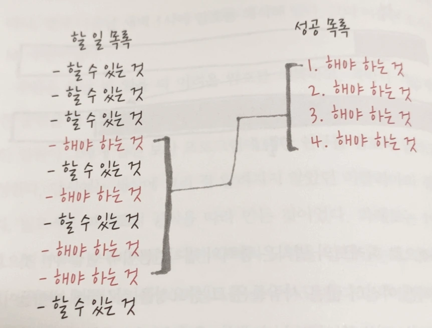 '할 일 목록' 대신 '성공 목록'을 만들어야 한다. 목록의 가장 위에 있는 것은 그저 가장 먼저 떠올린 것에 불과하다... (생략) 성공을 염두에 두고 목록을 만들지 않으면 그것이 당신을 성공으로 데려다주지 못할 것이다. 할 일 목록에 우선순위를 정할 때 비로소 성공 목록이 된다.