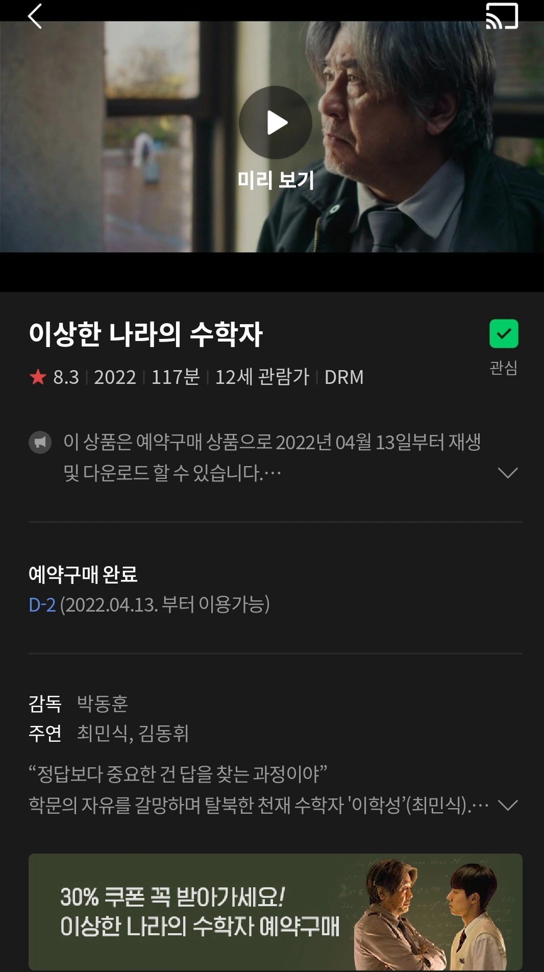 지금 네이버 시리즈 온에서 <이상한 나라의 수학자>를 16,390원 예약 구매 영화 30% 쿠폰 선물 이벤트 중이라 바로 결제했다.