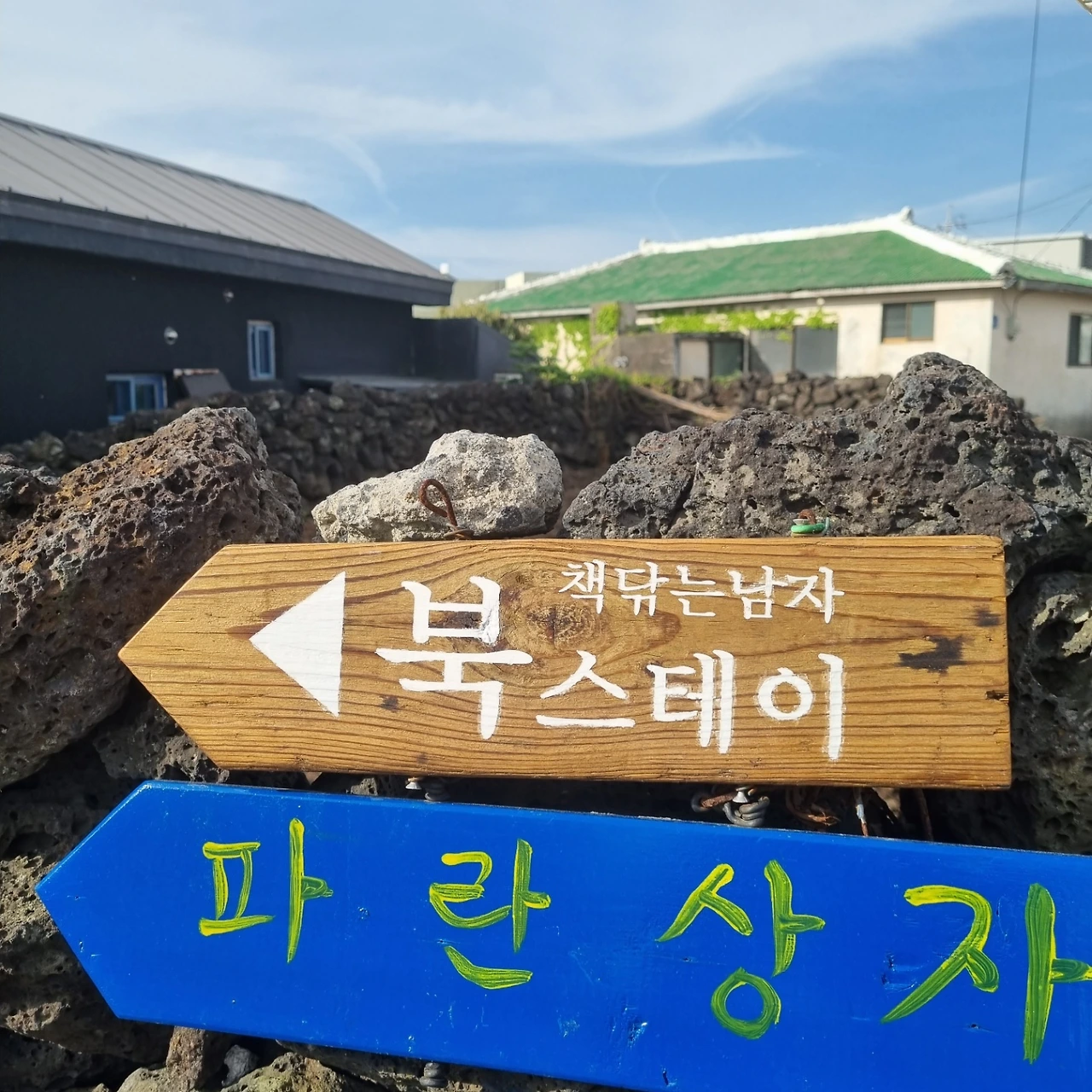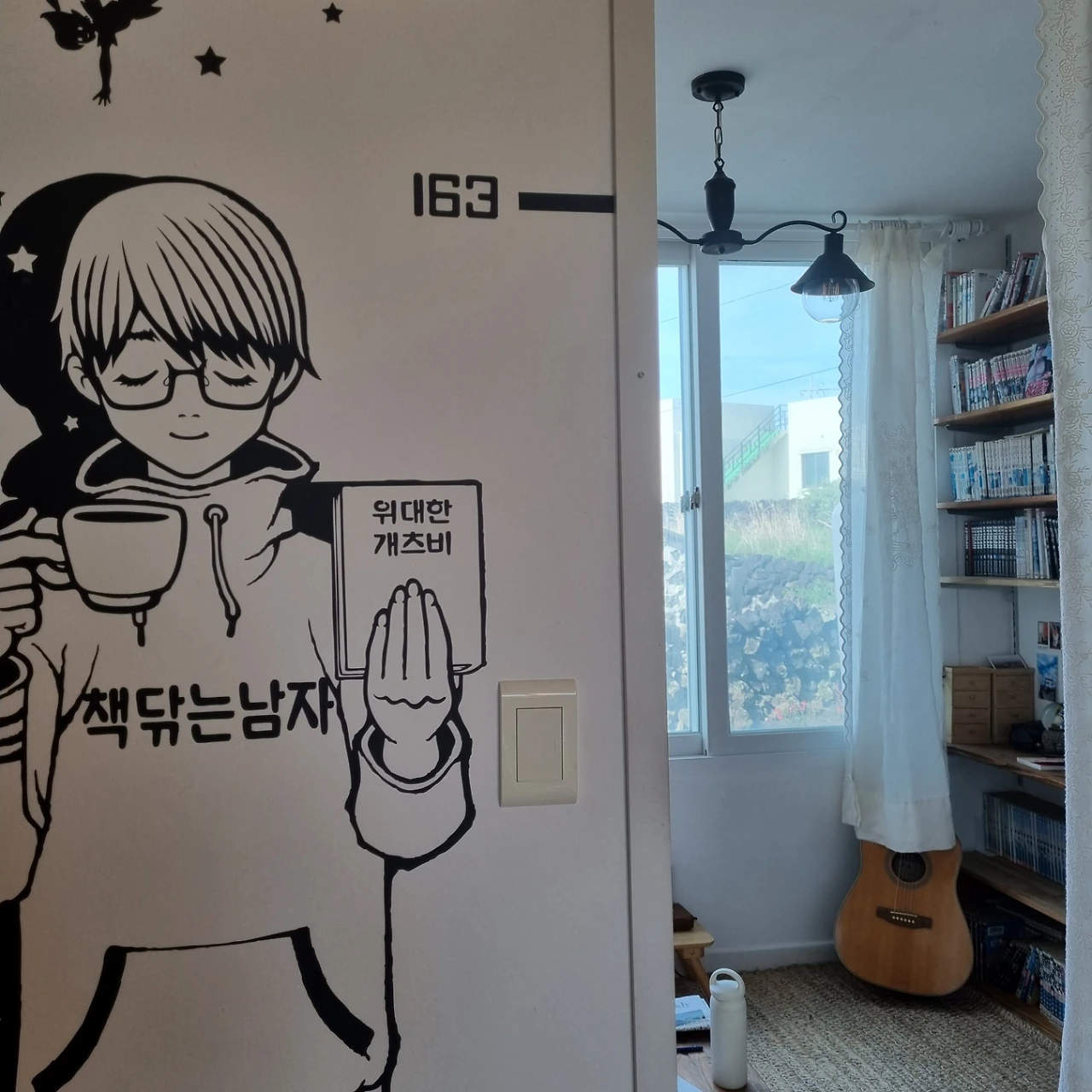 숙소는 북스테이로 예약했다. 작년부터 무조건 숙소는 책방과 함께 있는 곳을 예약하고 있다. 구좌에 머문 북스테이는 책방과 연결되어 있지 않고 숙소를 서재처럼 꾸몄다. 주인짱의 감성을 엿볼 수 있는 책들과 만화책(내 연배 정도 되는 것 같다)을 구비해 두었다.