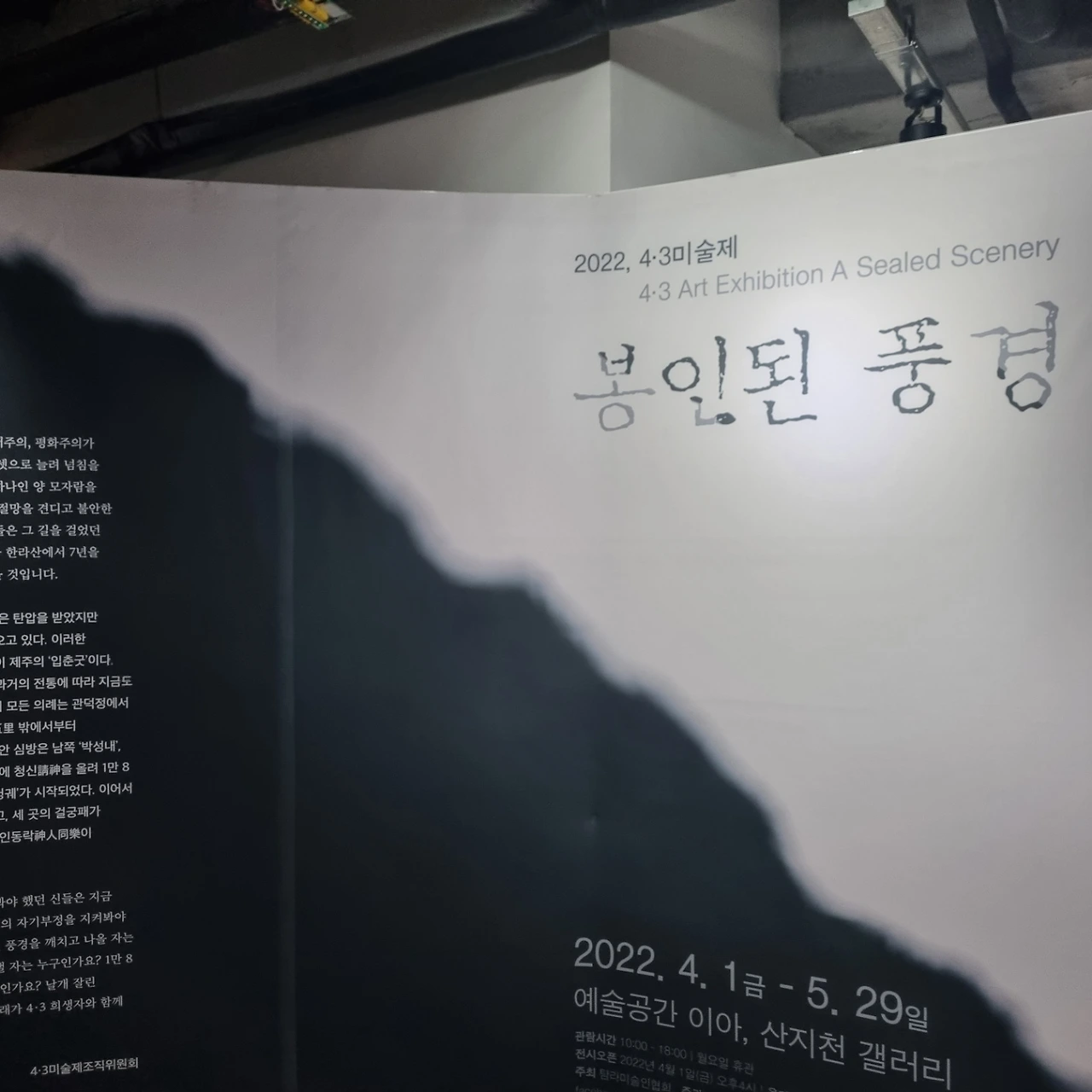 드디어 M을 만나는 시간. 거의 3년 만에 만나는 아끼는 후배다. 결혼하고 독박 육아 때문에 많이 힘들었던 것 같다. 지금은 제주도에서 쉬고 있다고 했다. 같이 걸으며 회포를 풀고, M이 좋아하는 산지천 갤러리에서 43 미술제 봉인된 풍경을 감상했다. 제주도에서 살면서 느낀 점을 들으며, 원주민의 사정과 배경을 외지인이 다 이해하기 힘들 거란 생각이 들었다. 제주도민은 동부와 서부를 서로 다르다고 느낀다고 한다. 외지인이 봤을 때 다 같은 제주도인데 동부는 훨씬 척박하다고 한다. 43 피해도 동쪽이 더 심했다.