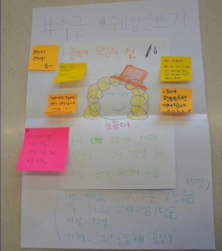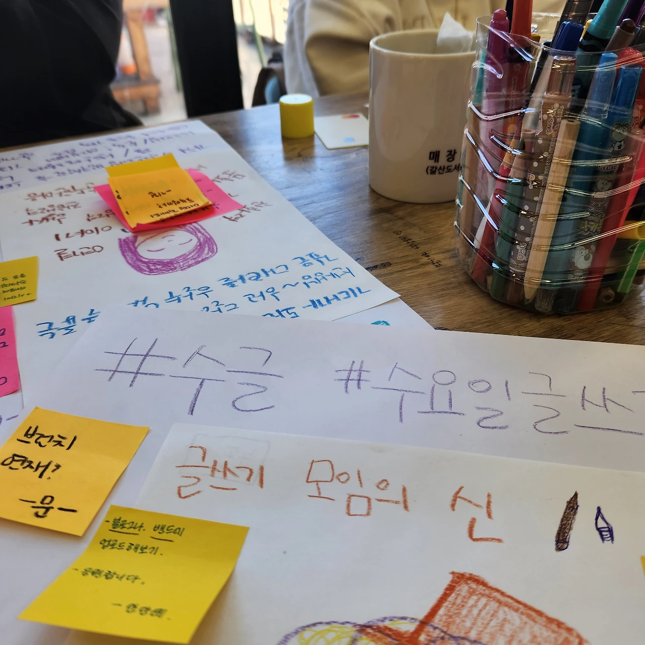 #수글은 그야말로 각자 글 쓰는 시간을 할애하기 위한 모임이다. 퇴근 후 강제적으로 약속을 잡아 억지로 글을 쓰는 것이다. 피곤하다고 비가 온다는 핑계 등을 대고 집에 가는 것을 방지하고자 글쓰기 모임을 만들었다.