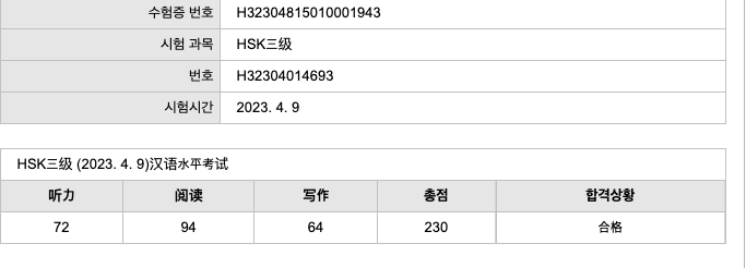 이게 나의 마지막 어학 시험이다. 억지로 시험까지 봤지만 결과가 좋으니 뿌듯하다. 내년에 대만 여행가서 공부한 걸 써먹어야겠다.