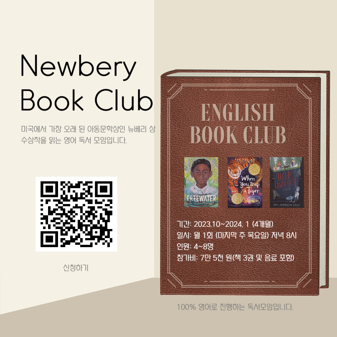 Newbery Book Club (Season 1) Month: October 2023 ~January 2024 Date: Fourth Thursday of the Month Time: 8 pm Venue: Book Salon But Fee: 75,000 KRW (includes three books & beverages) Contact: kat2rina@naver.com Timeline & Reading List 26 October 2023: Orientation 23 November 2023:<Free