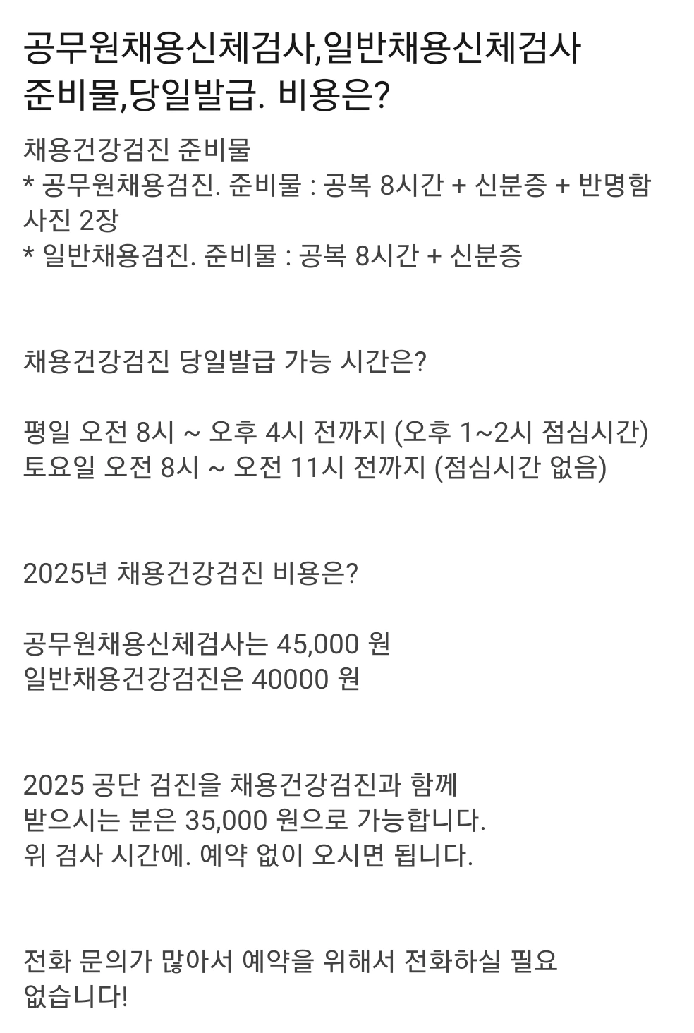 채용검사서에 대해 검색하다가, 검사 당일 검사서를 발급해 주는 병원도 있다는 걸 알게 되었다.