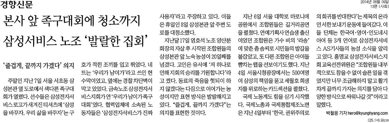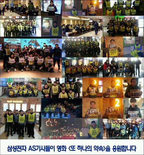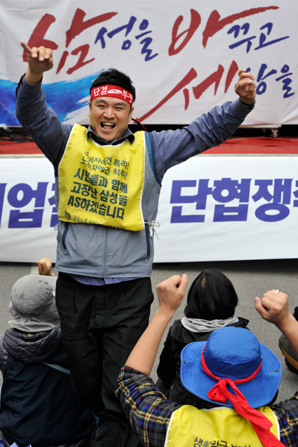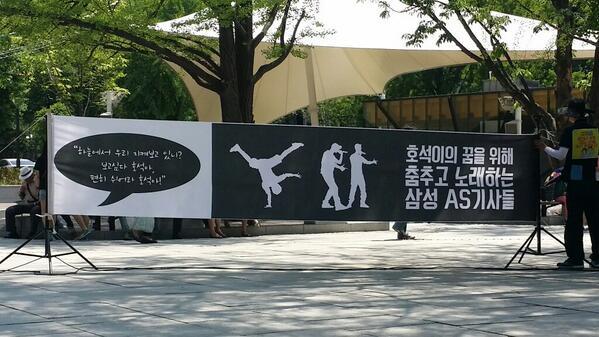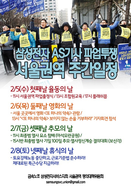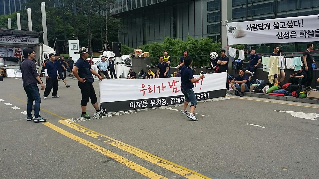 까무잡잡한 남자들이 아스팔트에 모여 족구를 하고 하수구 까지 청소를 하고, 경찰 앞에서 춤도 추었다. 다름 아닌 지난 5월 17일 염호석 열사의 자결 이후 5~6월 여름 내 50여일간 지속되었던 삼성전자서비스 노동자들의 노숙농성 투쟁 때의 모습이다. 이렇게 월화수목금 평일 간 서울 시내 이곳저곳을 돌아다니며 투쟁을 지속한 조합원들은 주말 정비활동을 한다.