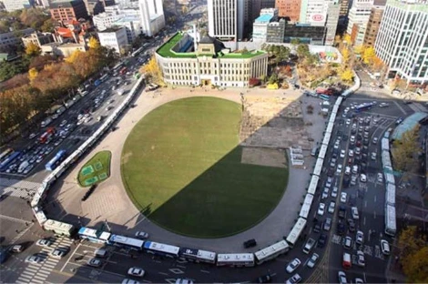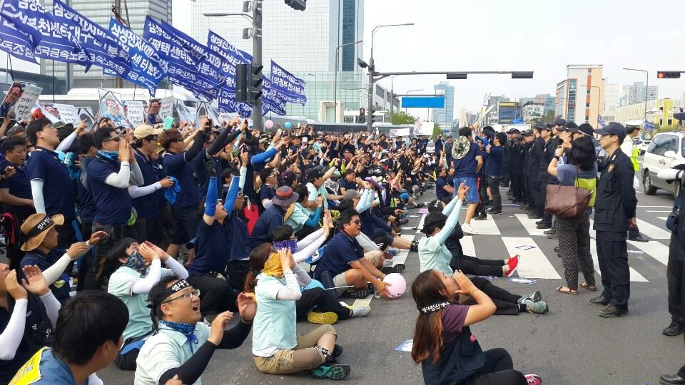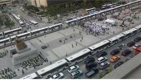요즘은 이렇게 우리 노동자들이, 저항하는 시민들이 한군데 쫌 모인다 싶으면 이렇게 닭장차를 둘러 에워싸고, 여러 시선들로부터 가리고, 시민과 우리를 유리시켜버리곤 한다. 사방이 빽빽하게 닭장차로 둘러막힌 광장, 그 너머에서 버스 차창으로 외계인 보듯이 우릴 보는 사람들을 보며 생각했다. “저기 지나가는 저 시민들은 우리를 어떻게 볼까?”