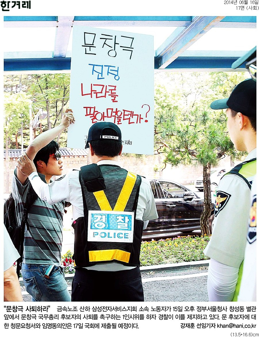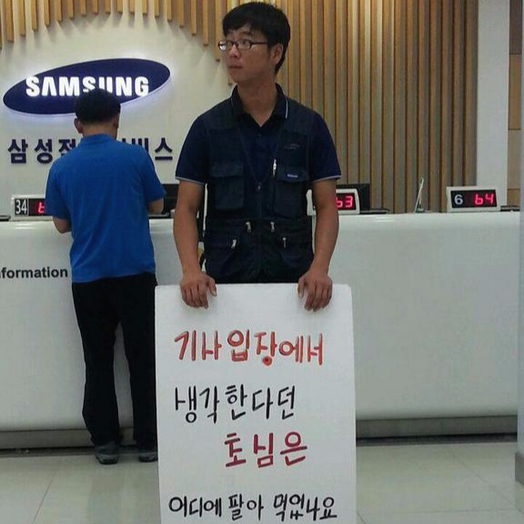 기억하실지 모르겠다. 딱 3년 전이다. 2014년 5월 17일, 서른네살의 청년 노동자, 하청 수리기사, 국내 최대 기업의 삼성전자를 진짜 사장으로 둔 자회사의 하청센터의 수리기사 염호석이 싸늘한 시체로 발견됐다. 서른두살 에어컨 수리기사 최종범 열사의 죽음 이후 불과 반 년만이었다. 삼성전자서비스지회는 시신을 서울로 옮겨 빈소를 차렸지만, 이튿날 경찰의 폭력적 침탈에 의해 시신을 빼앗겼다. 정말 천인공노할 사건이었고, 영원히 잊을 수 없을 것이다. 그 일을 저지른 자들을 결코 용서하기 어렵다.