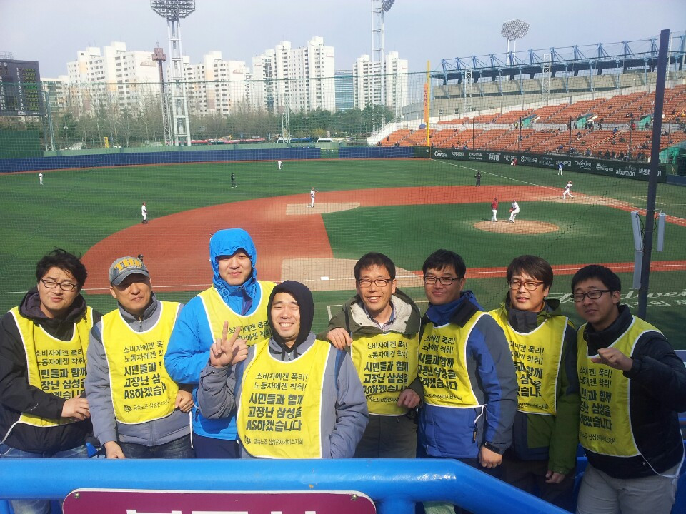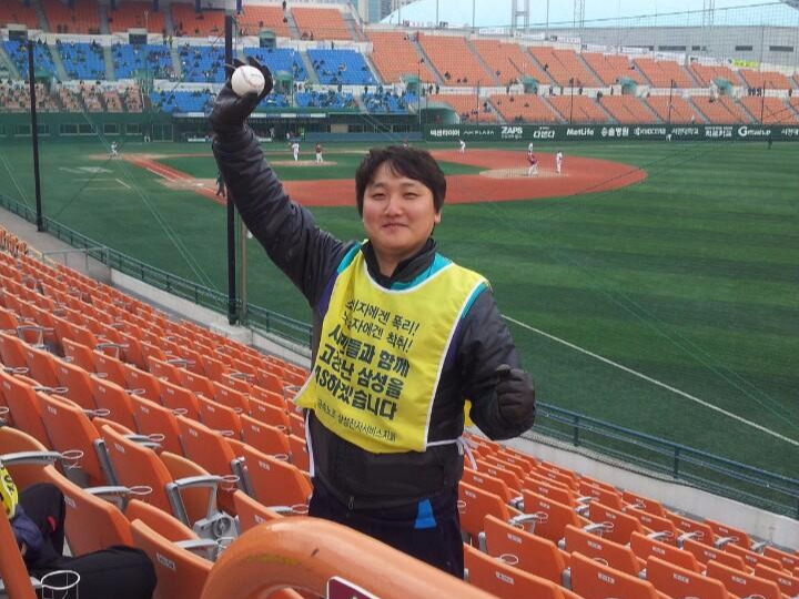 프로야구 시즌이 시작됐다. 삼성라이온스의 경기가 있는 날 목동 야구장을 찾았다. 상대 팀 펜스에서 상대 팀을 응원하는 컨셉이었다. 삼성 선수가 친 파울볼을 잡아내는 성과도 있었다. 품은 전혀 들지 않았지만, 조합원들이 흥겹게 움직일 수 있는 기획이었다.