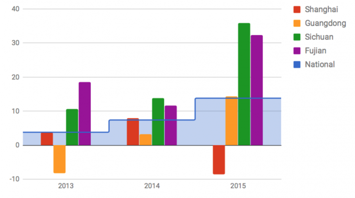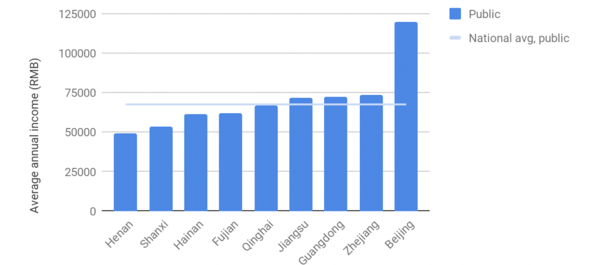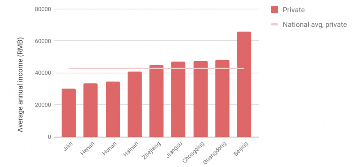 이번 달 중국통계청이 발표한 지역 임금 데이터는 지자체들 간 평균 소득에서 큰 격차를 보이고 있다. 예를 들어, 베이징의 민간기업 연간 평균 임금은 65,881 위안(2017년 7월 31일 환율 기준 약 1098만 원)으로, 이는 30184 위안(약 503만 원)인 지린성(길림성)의 2배에 달한다.