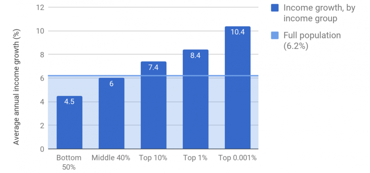 최고 부유층의 소득은 중국의 발전이 이뤄진 지난 40년 간 수직 상승해왔다. 중국의 연간 국내총생산(GDP) 성장률이 1978년 이래 2배 가량 오르는 사이, 하위 50%의 연간 평균 임금 성장은 단지 해마다 4.5% 정도 올랐을 뿐이고, 상위 1%의 소득은 2배 가량 오르고, 상위 0.001%의 최상위 부자들이 매해 10.4%로 가장 빠른 소득 성장을 이루었다.