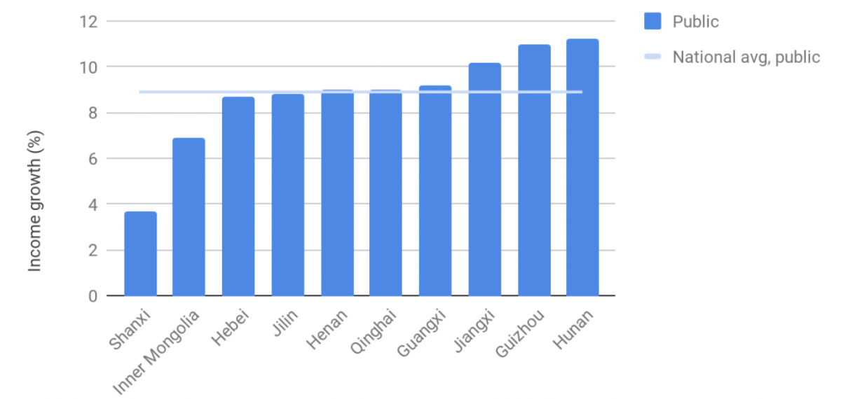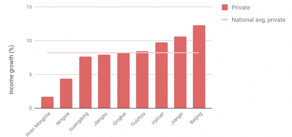 게다가, 더 높은 소득이 있는 지역들은 가장 빠른 임금 상승을 경험하고 있고, 더 부유하고 더 가난한 지방일수록 격차는 심해지고 있다. 데이터는 또한 내몽골이나 닝샤와 같은 더 빈곤한 지역에서는 각각 1.7%, 4.4% 오르는데 그치는 사이, 베이징 민간부문의 임금이 지난 해 12.3% 올랐음을 보여준다.