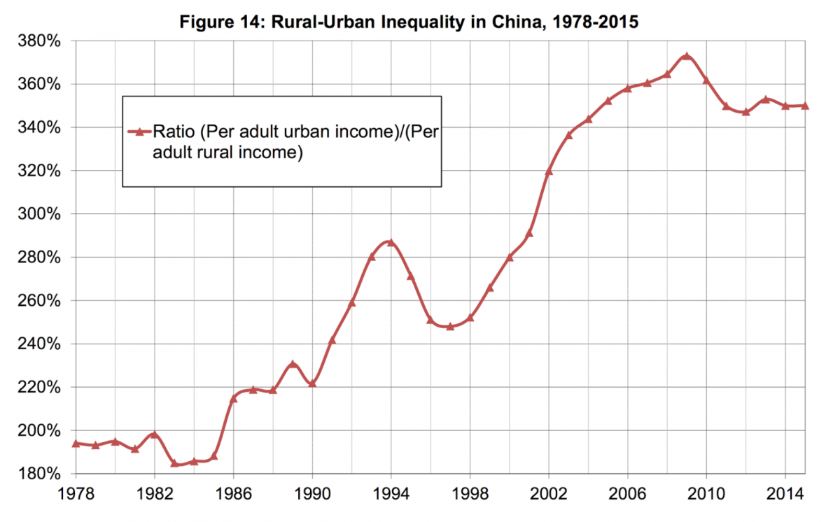 도농 지역간 격차에 있어서, 피케티 등 연구자들은 농촌에 비해 도시의 평균 임금이 1978년 200% 미만이었던 것에서 2015년에는 350% 정도인 것을 발견했다.