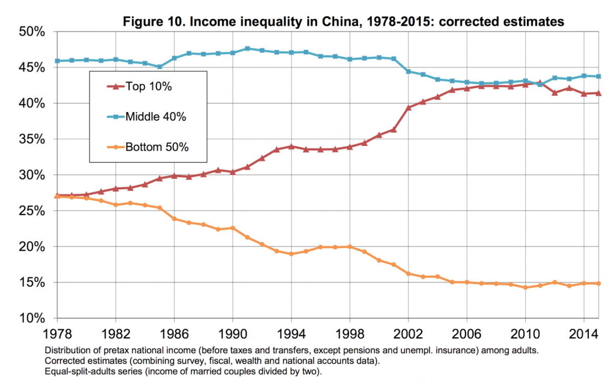 피케티 등의 논문에 따르면, 빈곤층과 부유층의 격차는 점점 커지고 있다. “상위 10%의 국내 소득 중 소득 점유가 1978년 27%에서 2015년 41%로 올랐다. 그 사이 하위 50%는 27%에서 15%로 낮아졌다.”