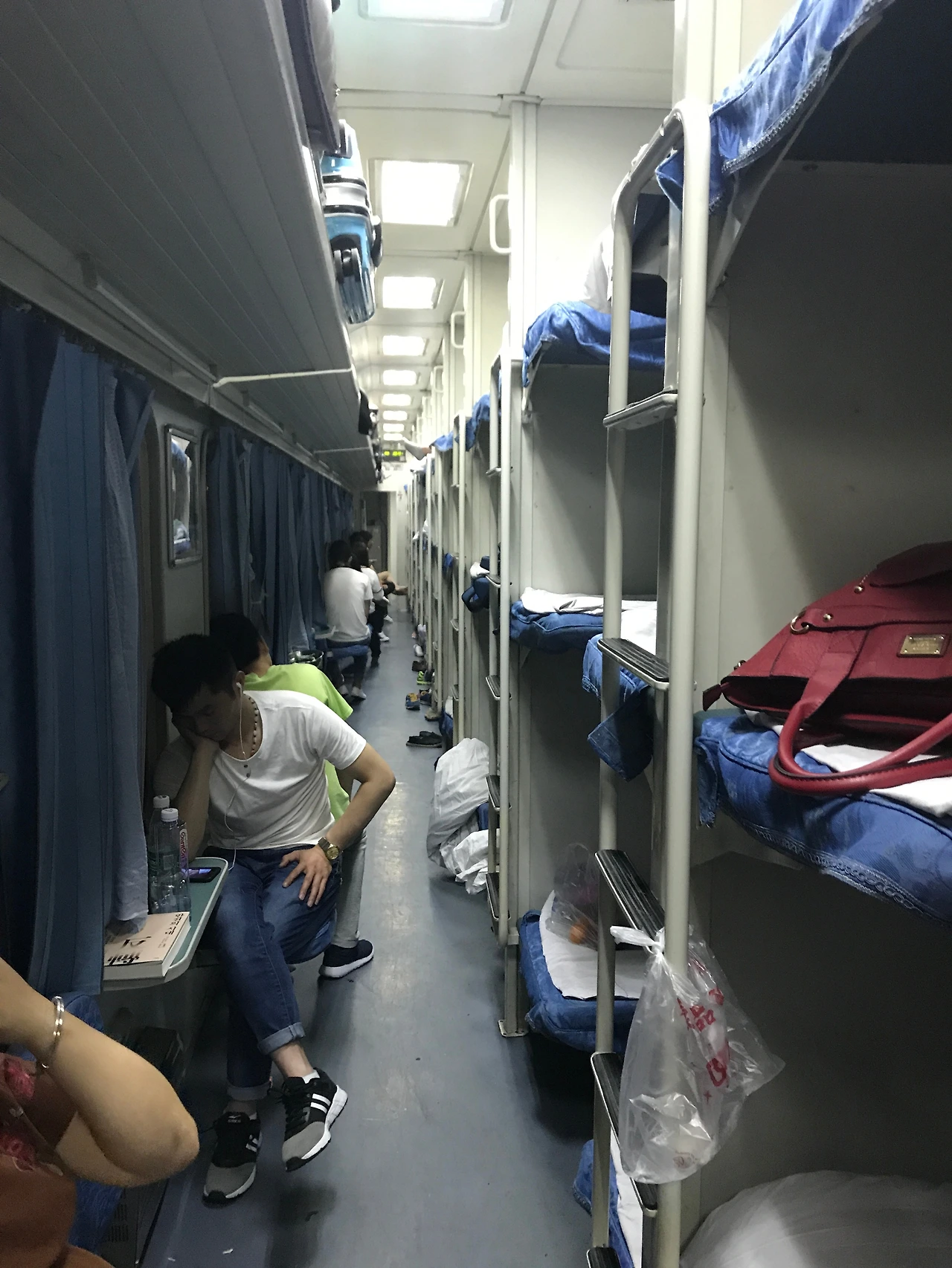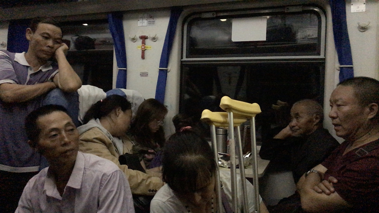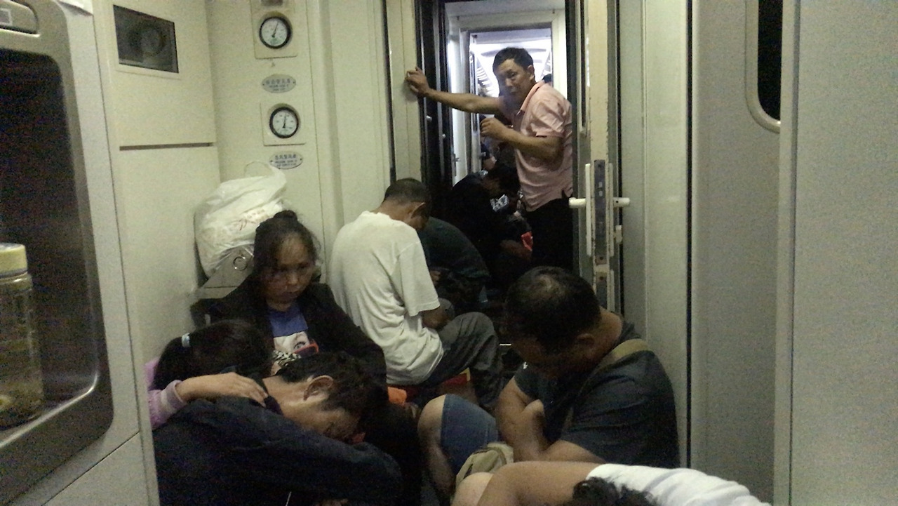 그런데 문제는 그게 아니었다. 녹색기차를 18시간 동안 타고 간다는 건 거의 극기훈련에 가깝다는 걸 몰랐었다. 나는 침대 열차칸의 여유로움만 생각했지, 좌석칸에 사람들이 그렇게 바글바글하다는 걸 몰랐었다. 놀랍게도 좌석칸에는 빡빡하게 앉아 있는 승객들만이 아니라, 입석으로 타서 복도에 쭈그려 앉아 있는 사람들, 화장실 앞에서 돗자리를 깐 일가족, 남의 자리 모서리에 걸터 앉는 아주머니, 좌석 옆에서 담배 피는 아저씨 등등 수백여 명의 사람들이 함께 있었다. 나는 이 험난한 여행을 전혀 예상하지 못 했어서 너무 놀랐고, 또 열차 안의 에어컨이 너무 쌔서 두 번 놀랐다.