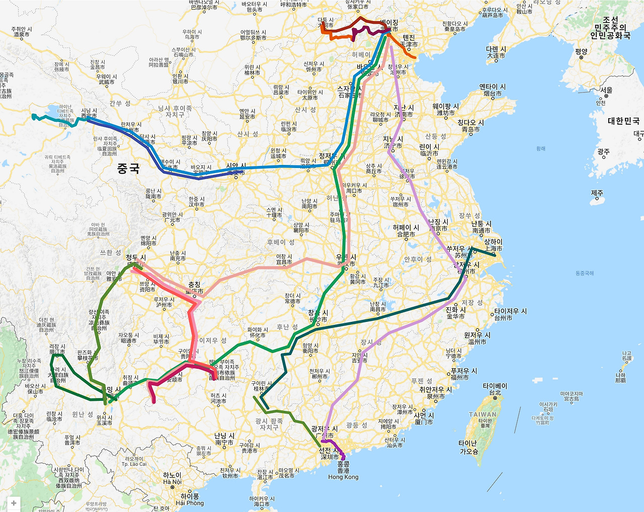 최근 1~2년 사이 나는 여러 차례 기차 여행을 했다. 3주 후에는 광둥성을 향해 기차를 타고 떠난다. 며칠 전 이 루트를 기록해놔야겠다는 생각이 들어서 구글맵을 이용해 루트를 그렸다. 2017년 5월부터 2019년 1월 사이의 여행 루트니, 18년 전 여행은 제외했다.