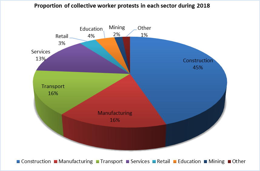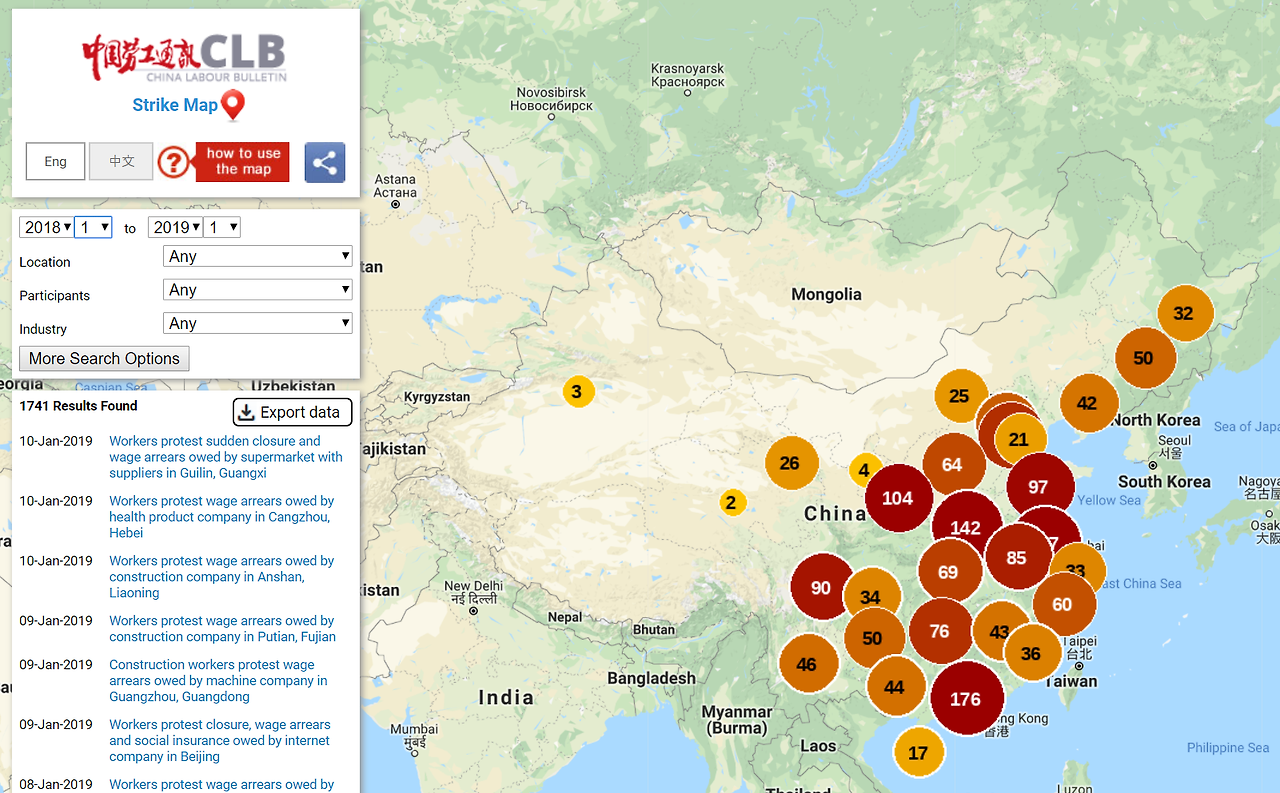 2000년 이후 제조업 영역을 위주로 발생했던 중국 내 노동쟁의 비율은 지난 5년 간 지속적으로 변화하고 있다. 중국노공통신의 '파업 지도'(China Labour Bulletin’s Strike Map; https://maps.clb.org.hk/strikes/en)에 따르면 2014년 41퍼센트였던 제조업 노동쟁의 비율은 2018년엔 16퍼센트를 차지했다. 가장 높은 비율을 차지하는 건 건설업으로 45퍼센트였고, 운송업은 제조업과 같은 16퍼센트를 차지했다. 투쟁의 주요한 이유는 폐업 혹은 이주였다. 나아가 임금체불이 80퍼센트를 차지했는데, 이는 중국 제조업의 불안정한 상태를 반영한다고 할 수 있다.
