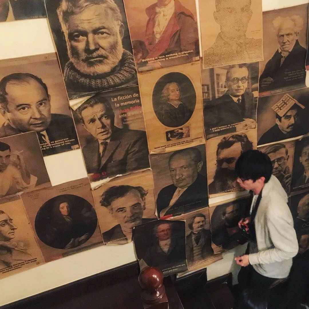 윗층으로 가려면 둥글게 올라가는 계단을 올라가야 했는데, 계단 벽에 전 세계 여러 예술가들의 초상이 붙어있었다. 이곳의 분위기를 확 느끼게 해주는 장소였다.