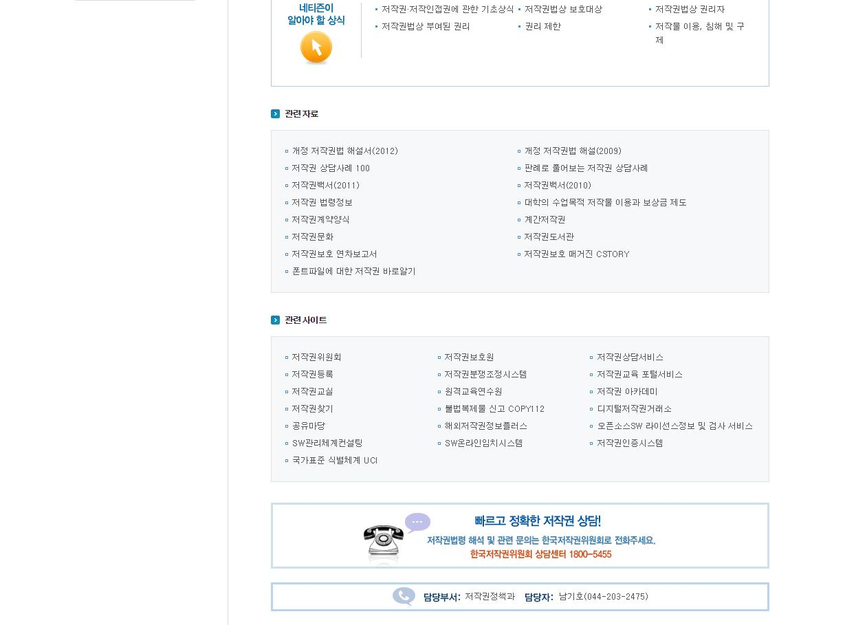 궁궁한 사항을 알아보자엔 저작권 확보 방안/소유권과 저작권/저작물 이용허락 일반/공연과 저작권/전시와 저작권/번역과 저작권/공공저작물 자유이용/행정목적을 위한 저작물 이용/공표된 저작물의 이용/공동·단체명의 저작물/저작권이 만료된 저작물/저작권 발생과 등록/배타적발행권/판권과 출판 인지/저작 인격권/북한 저작물/공공누리/기타
