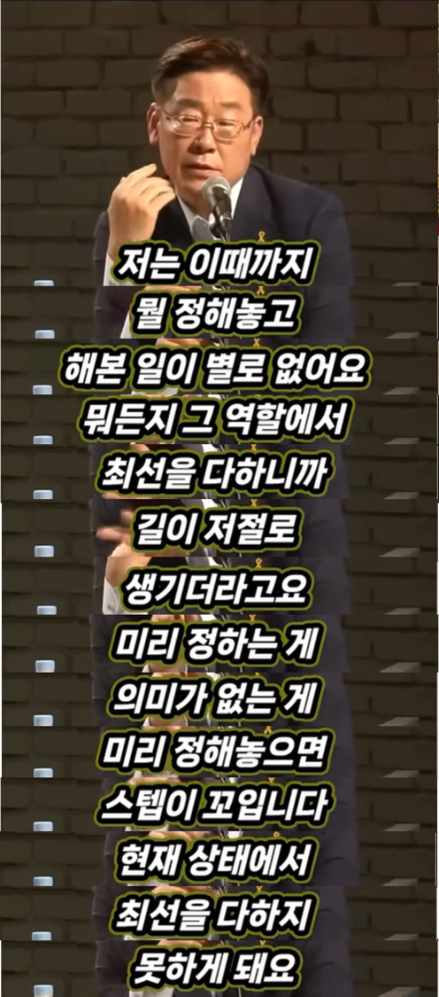 저는 이때까지 뭘 정해놓고 해본 일이 별로 없어요. 뭐든지 그 역할에서 최선을 다하니까 길이 저절로 생기더라고요. (중략) 미리 정하는 게 의미가 없는 게 미리 정해 놓으면 스텝이 꼬입니다. 현재 상태에서 최선을 다하지 못하게 돼요.