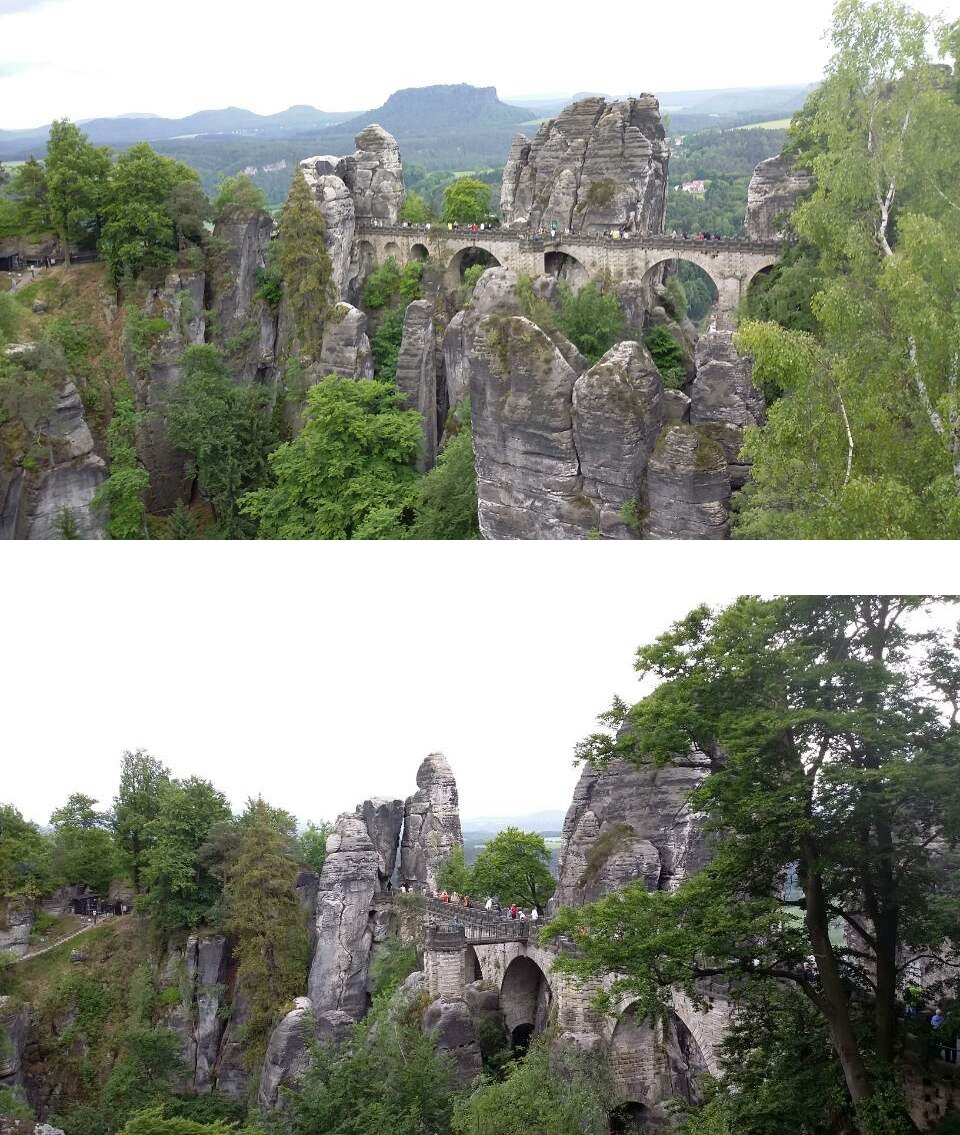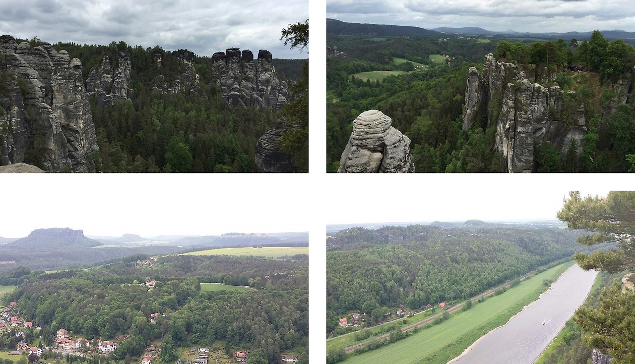 다시 여행 얘기로 돌아가자면 우리가 갔던 작센 스위스는, 스위스라는 별칭이 붙어 약간의 기대를 가질 법도 하나 평평한 지형이 대부분인 독일이나 체코에서 볼 때야 높은 산들이겠지만, 스위스를 연상시키면 오산이다. 그럼에도 천 개나 된다는 뾰족한 바위 봉우리들, 봉우리 위에 남아있는 여러 성 터들, 스페인의 론다 마을 같이 협곡 양쪽의 절벽과 절벽을 잇는 다리들과 그 산 밑을 흘러가는 엘베 강 등이 나름의 볼거리들이다.