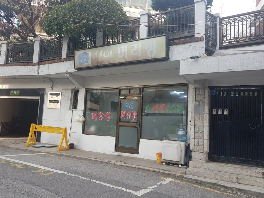 고급 주택 사이에 위치한 미용실, 빛바랜 간판과 레트로 한 스티커 글씨가 인상적이다