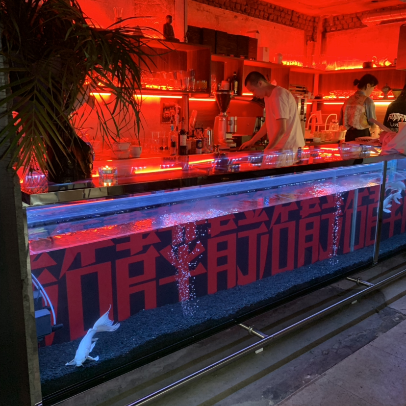 오른쪽에는 강렬한 조명이, 그 밑에는 헤엄치는 물고기가, 그리고 사방에 오리엔탈풍 물건이 가득했다. 새 것과 오래된 것이 한데 어우러져 있었다. 2층과 마찬가지로 동서양이 혼합된 느낌이어서 홍콩이 떠올랐다.