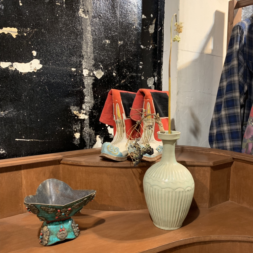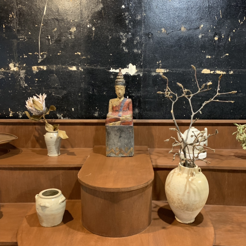 우선 특이한 오브제가 눈에 띄었다. 맨 꼭대기 중앙에 눈을 감은 부처상이 있어서 제단에 바쳐진 귀한 물건같이 보였다. 서양 문화권에서 살던 사람이 갑자기 동양 문화에 심취해 하나둘씩 모은 것 같은 느낌이랄까. 동양적이기도, 혹은 서양적이기도 했다.