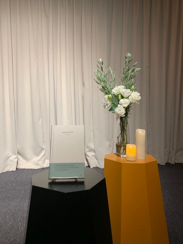 연출에 진심인지라 이번에도 할 수 있는 최선의 무대를 만들었다. 행사 전날 오후에 한 번 만들고, 당일 오전에 파란과 함께 남대문 시장을 휩쓸고 돌아와 꼬박 4시간 만든 무대. 오너먼트도 꼼꼼히 고르고, 지네전구 칭칭 감고, 유리병에 이렇게 저렇게 넣어보면서 만든 오브제들. 처음으로 꽃 도매 시장에서 라벤더 한 단과 리시안셔스 한 단을 데려왔다. 꽃을 마음껏 쓰고 푸지게 나눌 수 있어서 좋았다.