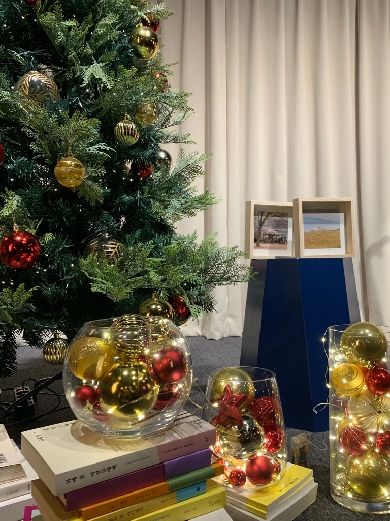 연말이고 크리스마스가 코앞이라서 쉽게 트리를 선택한 것은 아니었다. (진짜다.) ‘관객 학교’라는 이름이 너무 거대하거나 멀게 느껴지지 않게 하기 위해, 우리가 작가님의 아늑한 방에 초대받은 것처럼 느꼈으면 좋겠다고 생각했기 때문.